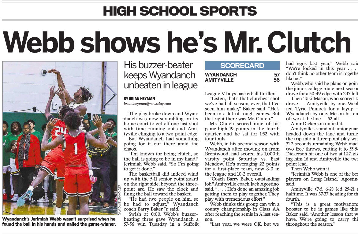 Congratulations to the boys basketball team on their thrilling victory against a talented Amityville squad! With just one second remaining, Jerimiah Webb sank an incredible three-pointer from beyond the arc as the buzzer sounded, securing the win in one of the most remarkable finishes in school history.